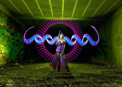 Su obra se basa en la técnica del light painting, que consiste en realizar fotografías de larga exposición en entornos oscuros mientras se trazan formas con diferentes fuentes de luz. Esta técnica no solo requiere dominio técnico, sino también una coreografía precisa entre el movimiento del artista y la exposición de la cámara. El resultado son imágenes impactantes, irrepetibles y llenas de energía visual, que nunca se repiten y que capturan la esencia del momento.